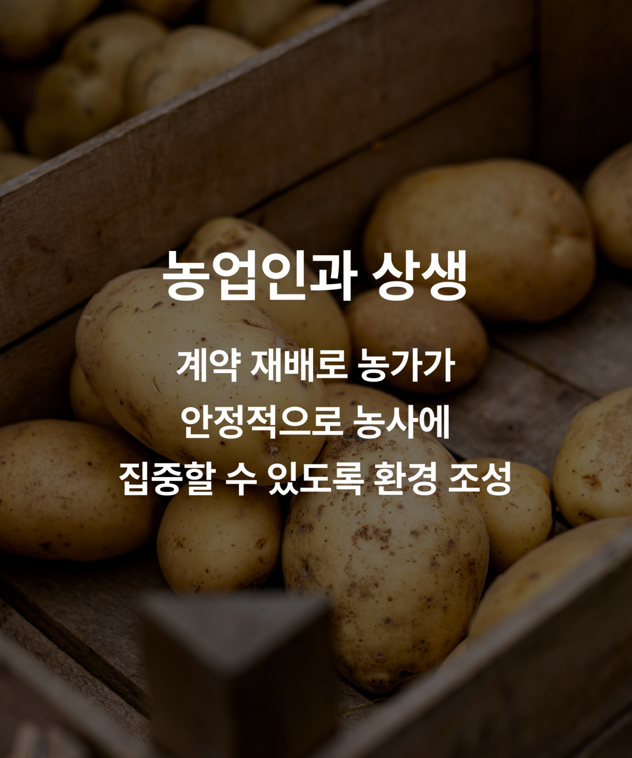 지속 가능한 농업의 첫걸음은농가의 안정적인 재배 환경을 만드는 일입니다.감자밭은 재배 품목, 물량, 단가 등을
